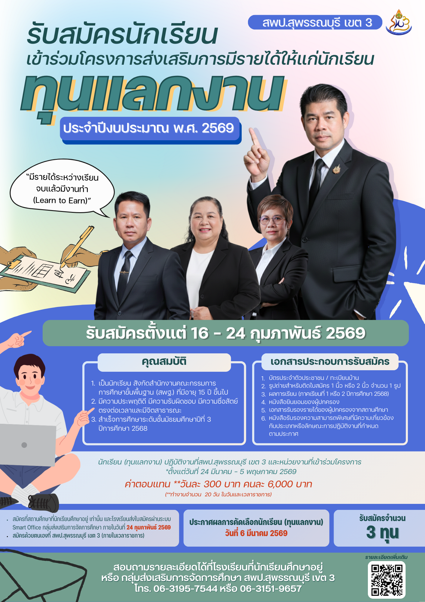 | ข่าวประชาสัมพันธ์ > ประชาสัมพันธ์รับสมัครนักเรียนเข้าร่วมโครงการส่งเสริมการมีรายได้ให้แก่นักเรียน (ทุนแลกงาน) ประจำปีงบประมาณ พ.ศ. 2569 | |